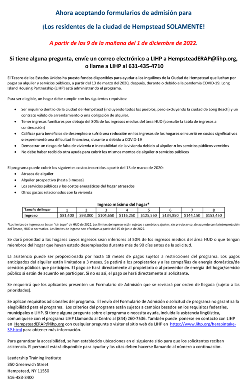 SOLO RECIDENTES DE LA CIUDAD DE HEMPSTEAD! (excluyendo la Ciudad de Long Beach)